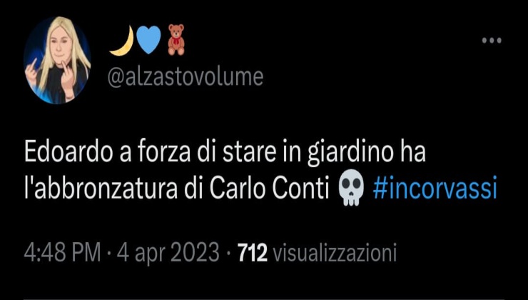 “Edoardo a forza di stare in giardino ha l’abbronzatura di Carlo Conti”. In effetti è ben risaputo che il conduttore ama esporsi al sole per curare il colore della sua pelle. Non a caso qualche comico si è sempre scherzato su questa sua caratteristica e ora è stata utilizzata per enfatizzare la situazione che riguarda appunto Edoardo.